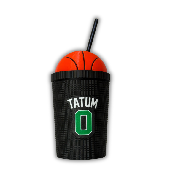 Vaso tipo milkshake de 300ml con tapa en forma de pelota de básquet, hecho en PLA y reutilizable.